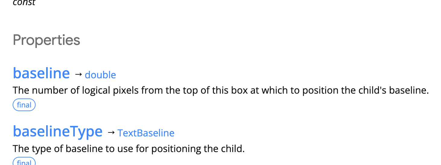 This widget shifts the child down such that the child's baseline (or the bottom of the child, if the child has no baseline) is baseline logical pixels below the top of this box, then sizes this box to contain the child. If baseline is less than the distance from the top of the child to the baseline of the child, then the child is top-aligned instead.